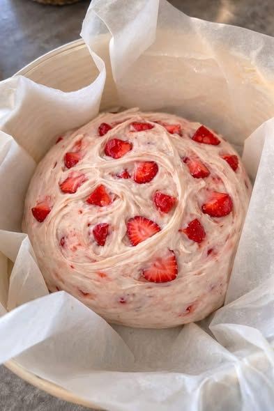 For extra presentation, you can place a few additional strawberry pieces on top of the batter.